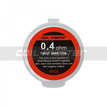 Coil master have produced these excellent pre-made coils. Two kanthal a1 wires (28AWG) twisted together and organic cotton.